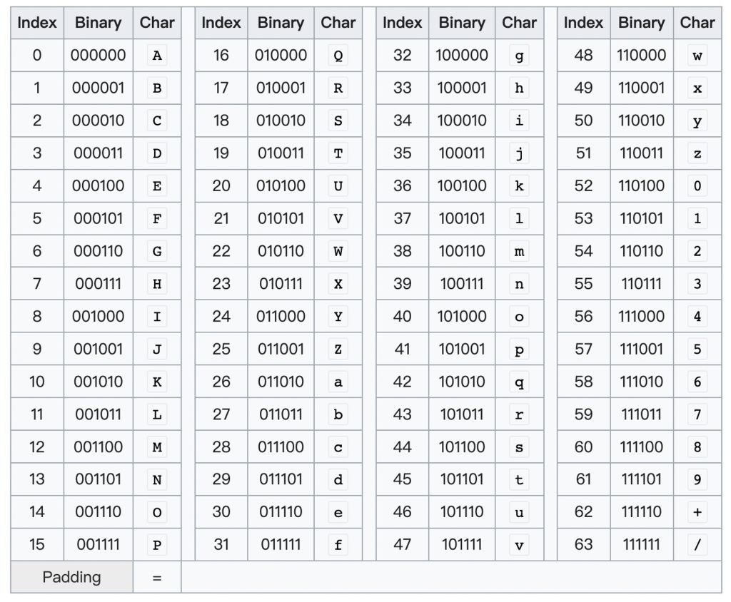 - Base64有64个字符, 2^6 = 64, 所以每个Base64编码字符可以用一个6位的二进制来表示